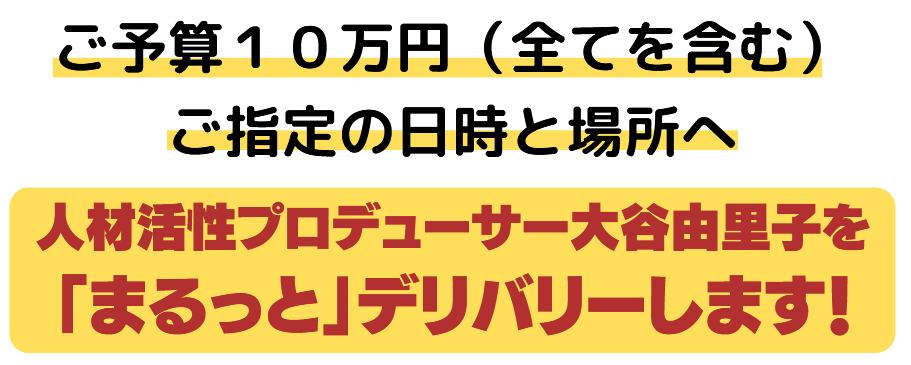 大谷由里子の 全国キャラバン始動! ✅主旨 20周年の感謝を込めて お贈りします。 ✅参加資格 言葉の力によって、ご自身や家族、職場や地域の未来を ポジティブな環境にしたいと願う人。(18歳以上) ✅実施の場所 日本国内 ✅予算 10万円(全てを含む) ※通常のご予算は 50万円+消費税 +交通費・宿泊費の実費 となります。 今回の企画は、 以下に記載の「5つの条件」を満たす 場合に適用となります。 ✅場所と日時 ご指定の日時・場所へ 大谷由里子を「まるっと」 デリバリーします。 (スケジュールは、先着順) ※想定される時間は、 1時間〜3時間。 ※スケジュールには 限りがあります。 ※既に先約があり、 ご希望の日時に添えない時は、 スケジュールの再調整を お頼みすることがあります。 先着順となることを、 予めご了承ください。